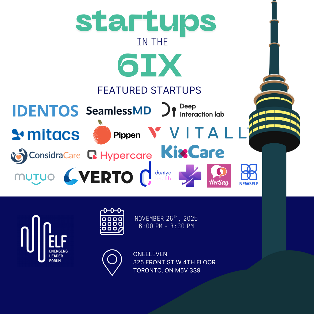 StartUps in the 6ix will include a fireside chat with Joshua Liu (SeamlessMD), and Tomi Poutanen (Signal 1), along with a startup expo showcasing all the startups in the healthtech ecosystem. To check out the startups who will be a part of the expo, please the image on the bottom. We will be showcasing each startup with a bio on our LinkedIn page.